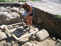 Wykop drugi. Niwelacja. Zaraz, będą coś wyrównywać? Aaa... nie - trzeba zmierzyć głębokość wykopu. Okazuje się, że to jedna z podstawowych czynności na wykopaliskach. Robi się to (podobnie jak u geodetów) przy pomocy niwelatora (lunety z podziałką, na statywie) oraz "łaty" (dłuuugiej miary trzymanej pionowo w wykopie). Udało mi się pomóc w pracy - na prośbę Magdy Kościukiewicz trzymałem "łatę" podczas pomiarów.